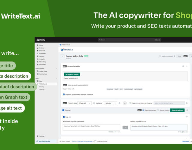 WriteText.ai, developed by 1902 Software, is a sophisticated AI-driven solution that eases the burden of content creation and boosts SEO for Shopify. It automates the production of fundamental content elements such as meta titles, meta descriptions, product descriptions, category summaries, Open Graph text, and image alt text, thus resolving content inefficiency through complete automation.