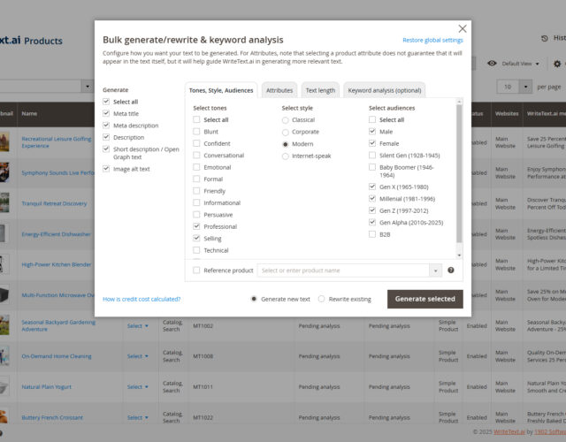 In contrast, Bulk Mode is designed for quickness and scalability, allowing batch production of content for expansive product catalogs with uniform tone and style. It accelerates the process with universal settings for consistent output, ideal for optimizing vast inventories economically.